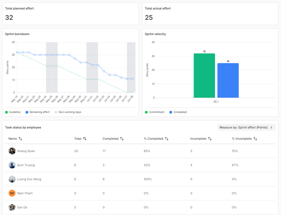 Total Actual Effort: Shows the actual effort your team expended to complete tasks in the sprint, allowing you to compare against the planned effort.
