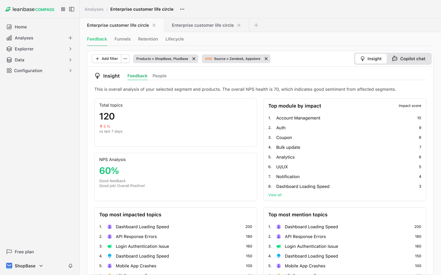Feedback Analysis in Leanbase provides a semantic layer to deep down on your wanna drill-down selected feedback through actionable insights about product health, people insights