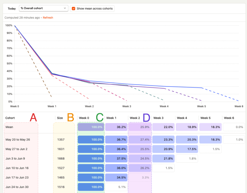 Column D+ – Subsequent periods (Week 1, Week 2, etc.), showing what percentage of users returned.