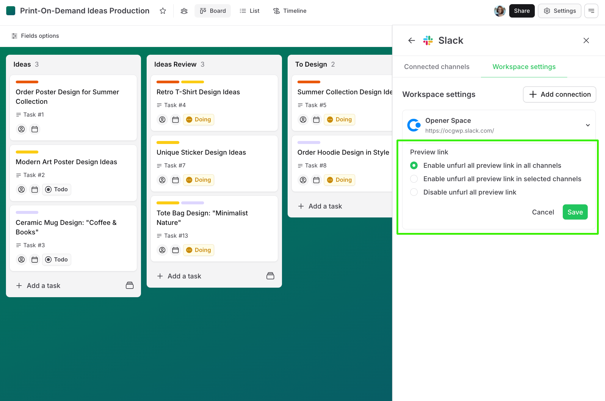 - Chọn các kênh cụ thể nơi các liên kết nhiệm vụ Leanbase sẽ được mở rộng với chế độ xem trước.