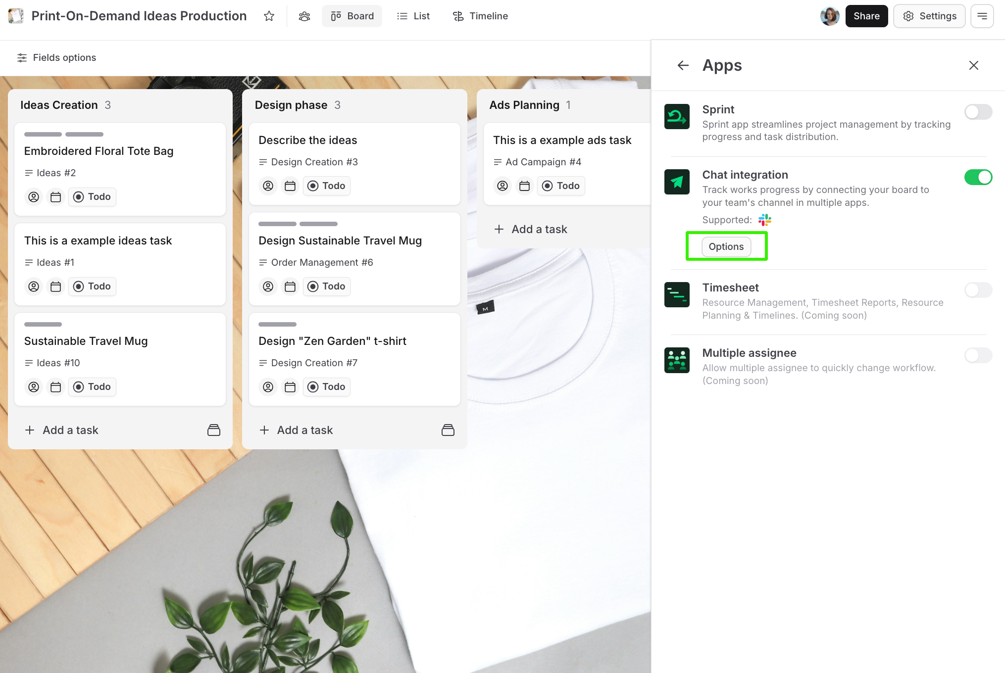 2. Bật tích hợp ứng dụng Slack trong bảng.